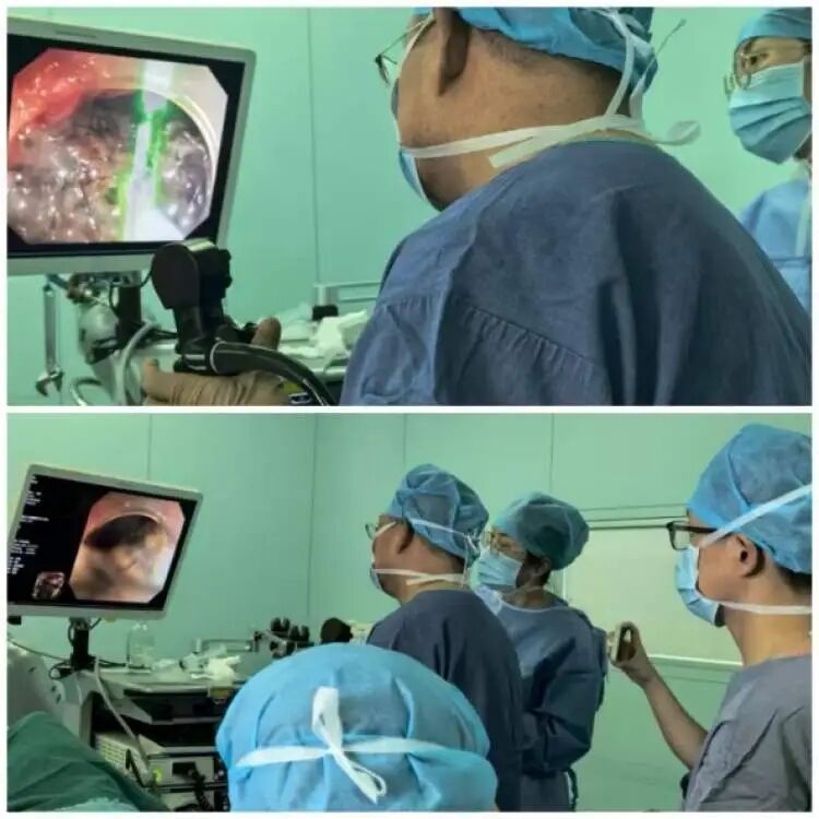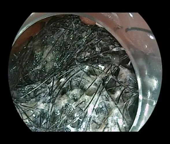 考虑到患者年轻、不愿留下手术疤痕的意愿,孟祥军主任医师和庞文璟副主任医师为她制定了详细的内镜下分次取石方案。由于发团缠绕紧密,并包裹着黏液和食糜,常规器械难以奏效。医疗团队不断创新操作方法,组合使用电圈套器、IT刀及自制器械,分块切割、钳取。在麻醉科和护理团队的密切配合下,经过数次手术、总时长超过40小时的努力,最终将毛发结石全部取出。